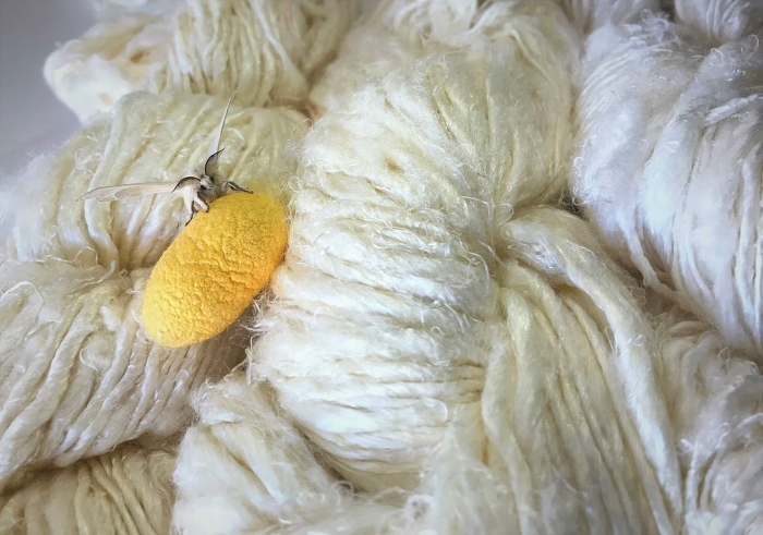 Abbiamo creato un network di 8 artigiani. Quindi, se non riesco a filare i bozzoli, li mando alla mia artigiana, le dico di che tipo di filato ho bisogno e lei mi rimanda il filato. Se abbiamo bisogno di un altro tipo di filato, c’è un altro artigiano che si è specializzato in quello. La stessa cosa accade per la tessitura: con noi collaborano delle tessitrici a cui posso inviare il filato.